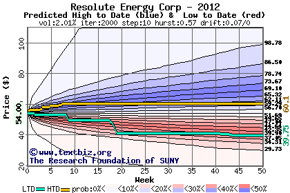 The high to date and low to date prices of the stock plotted against a random walk model for 2012 (what's this?).