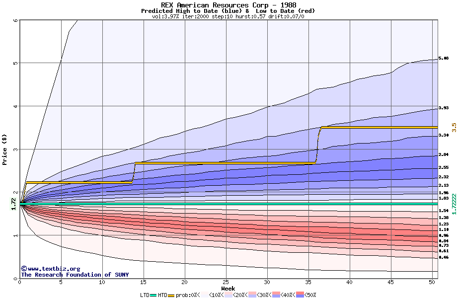 The high to date and low to date prices of the stock plotted against a random walk model for 1988 (what's this?).