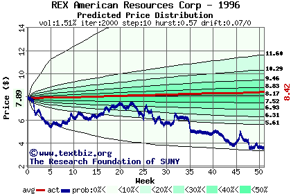 The high to date and low to date prices of the stock plotted against a random walk model for 1996 (what's this?).