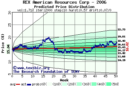 The high to date and low to date prices of the stock plotted against a random walk model for 2006 (what's this?).