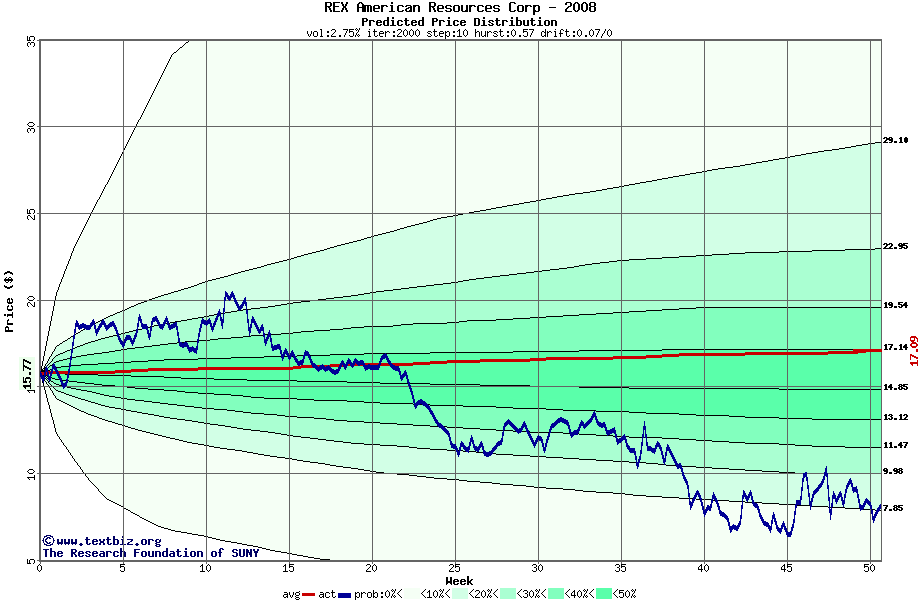 The following graph plots the year-to-date performance of the stock for 2008 compared to the probability calculated by a random walk model.