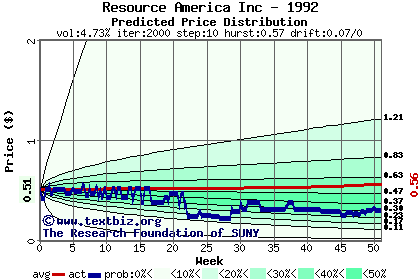 The high to date and low to date prices of the stock plotted against a random walk model for 1992 (what's this?).