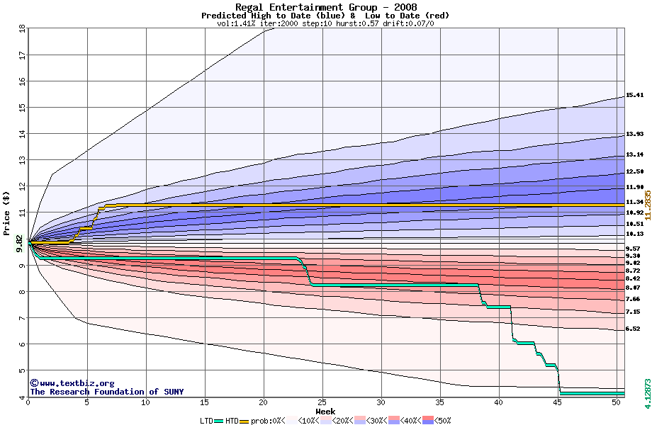 The high to date and low to date prices of the stock plotted against a random walk model for 2008 (what's this?).