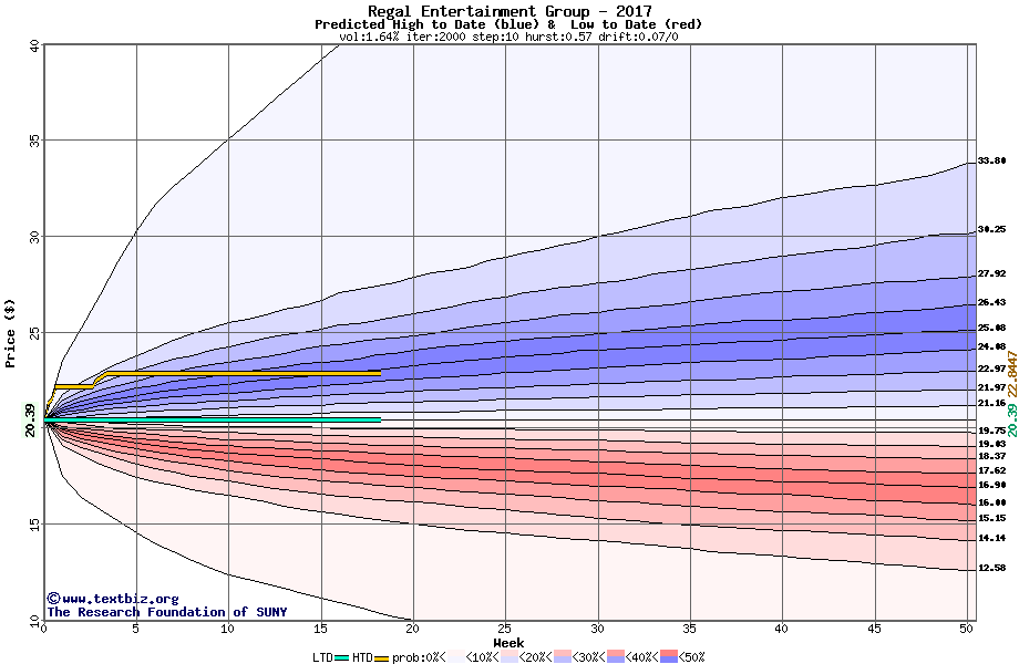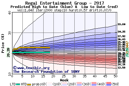The high to date and low to date prices of the stock plotted against a random walk model for 2017 (what's this?).