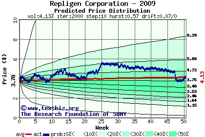 The following graph plots the year-to-date performance of the stock for 2009 compared to the probability calculated by a random walk model.