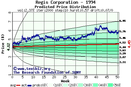 The high to date and low to date prices of the stock plotted against a random walk model for 1994 (what's this?).