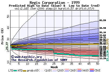 The high to date and low to date prices of the stock plotted against a random walk model for 1999 (what's this?).