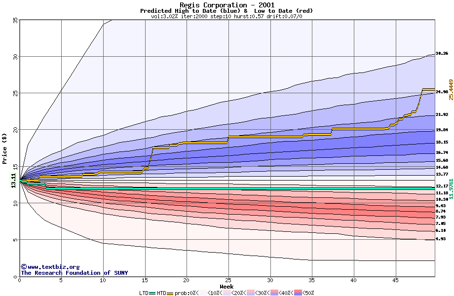 The high to date and low to date prices of the stock plotted against a random walk model for 2001 (what's this?).