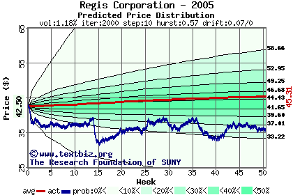 The following graph plots the year-to-date performance of the stock for 2005 compared to the probability calculated by a random walk model.