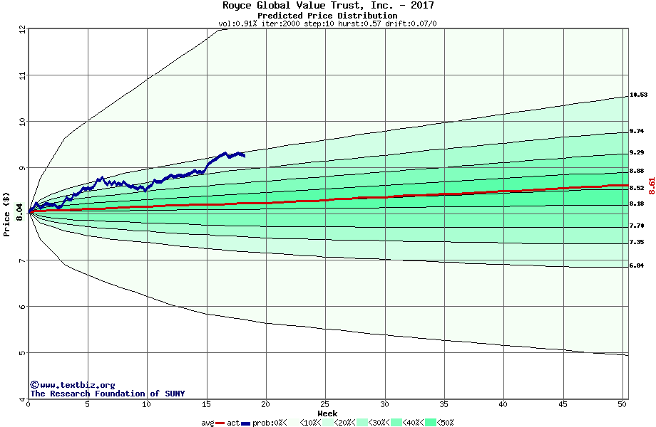 The high to date and low to date prices of the stock plotted against a random walk model for 2017 (what's this?).