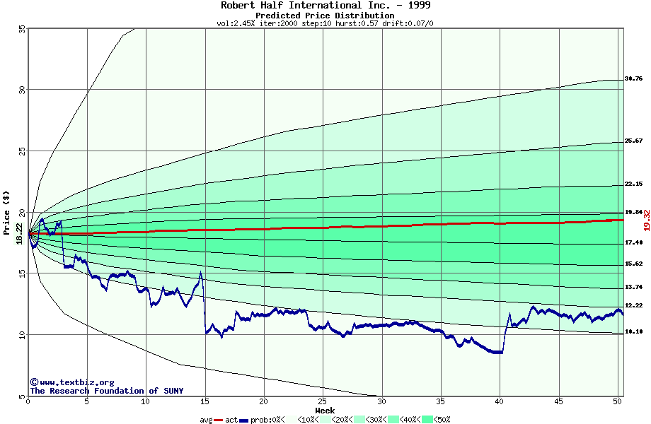 The following graph plots the year-to-date performance of the stock for 1999 compared to the probability calculated by a random walk model.