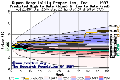 The high to date and low to date prices of the stock plotted against a random walk model for 1997 (what's this?).