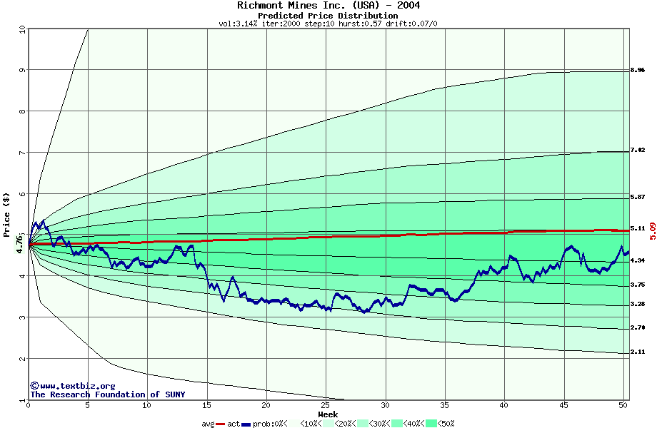 The high to date and low to date prices of the stock plotted against a random walk model for 2004 (what's this?).