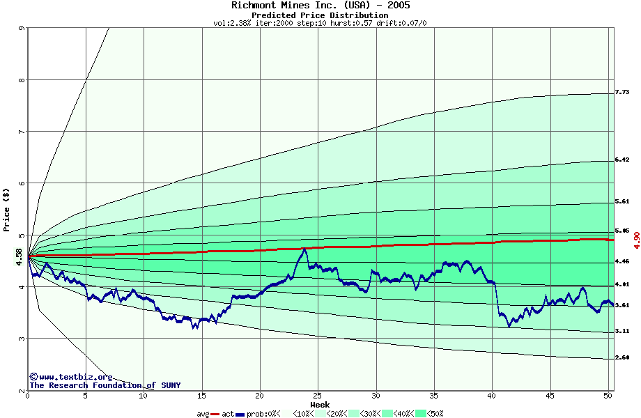 The high to date and low to date prices of the stock plotted against a random walk model for 2005 (what's this?).