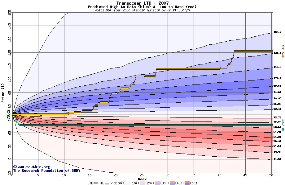 The high to date and low to date prices of the stock plotted against a random walk model for 2007 (what's this?).