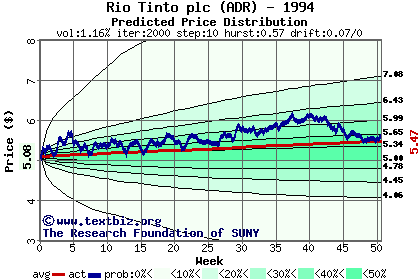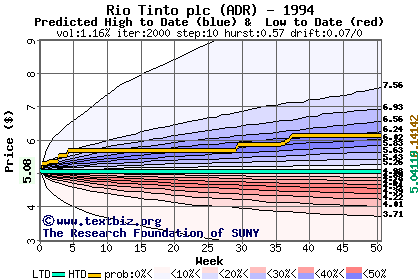 The high to date and low to date prices of the stock plotted against a random walk model for 1994 (what's this?).