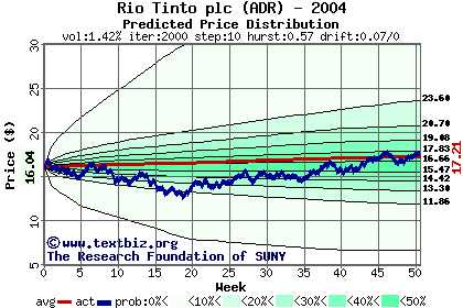 The high to date and low to date prices of the stock plotted against a random walk model for 2004 (what's this?).