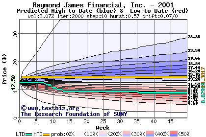 The high to date and low to date prices of the stock plotted against a random walk model for 2001 (what's this?).