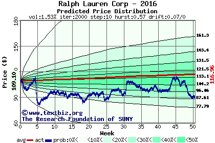 The high to date and low to date prices of the stock plotted against a random walk model for 2016 (what's this?).