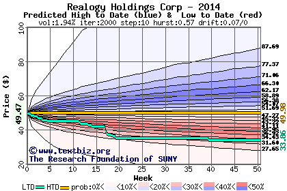 The high to date and low to date prices of the stock plotted against a random walk model for 2014 (what's this?).