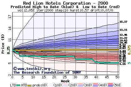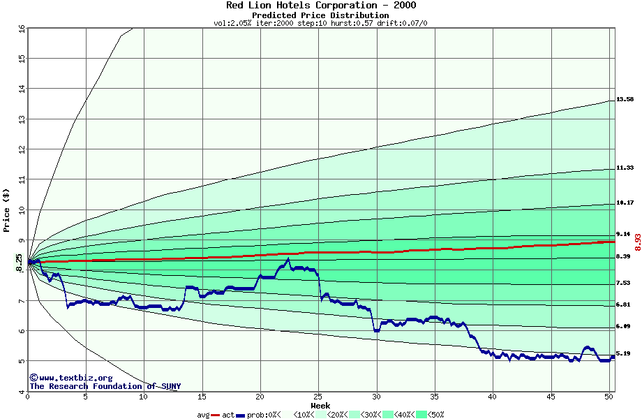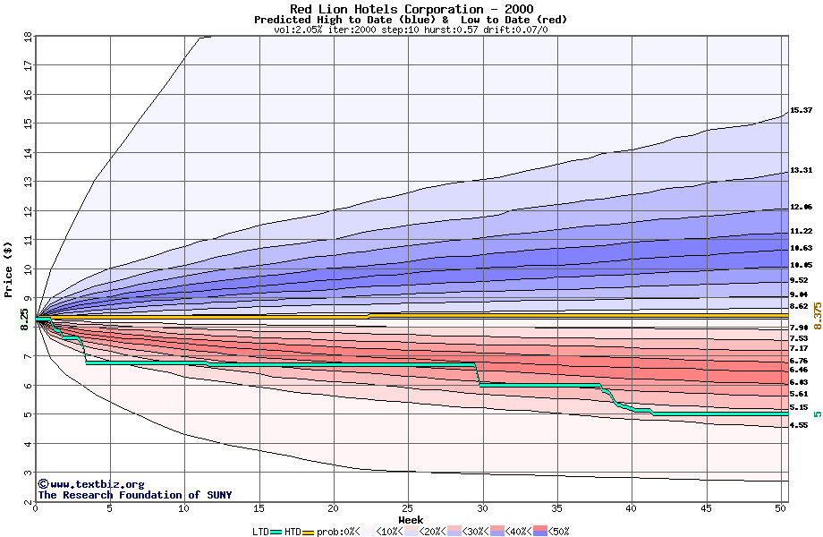 The high to date and low to date prices of the stock plotted against a random walk model for 2000 (what's this?).