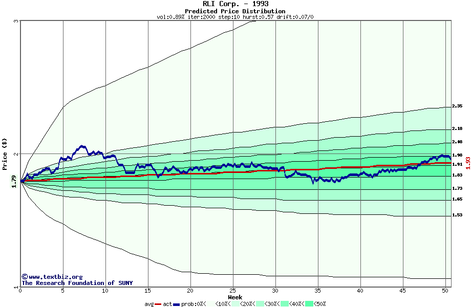 The following graph plots the year-to-date performance of the stock for 1993 compared to the probability calculated by a random walk model.