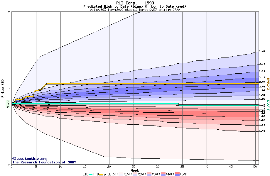 The high to date and low to date prices of the stock plotted against a random walk model for 1993 (what's this?).
