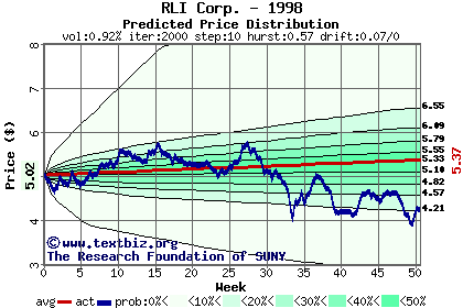 The high to date and low to date prices of the stock plotted against a random walk model for 1998 (what's this?).