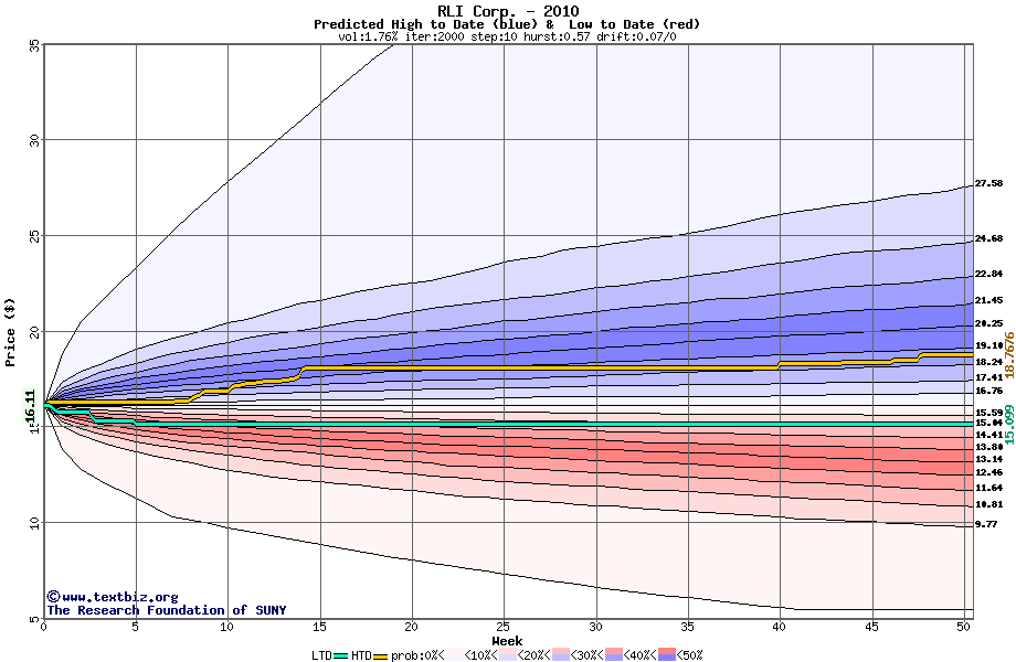 The high to date and low to date prices of the stock plotted against a random walk model for 2010 (what's this?).