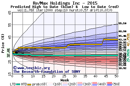 The high to date and low to date prices of the stock plotted against a random walk model for 2015 (what's this?).