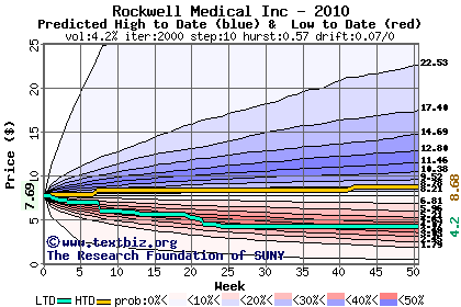The high to date and low to date prices of the stock plotted against a random walk model for 2010 (what's this?).