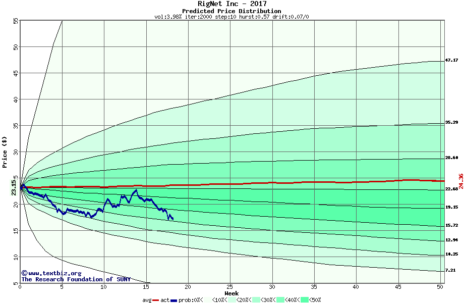 The following graph plots the year-to-date performance of the stock for 2017 compared to the probability calculated by a random walk model.