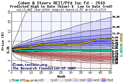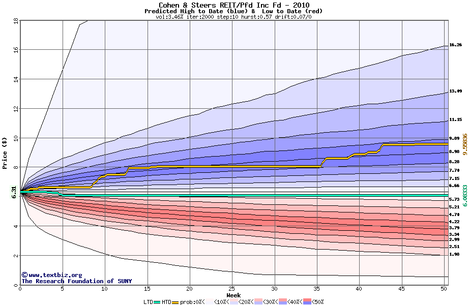 The high to date and low to date prices of the stock plotted against a random walk model for 2010 (what's this?).