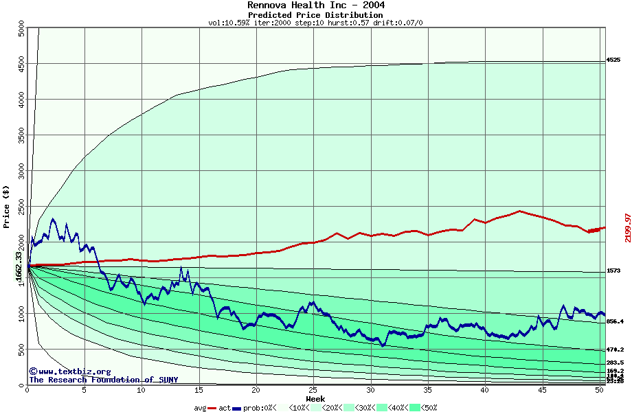 The following graph plots the year-to-date performance of the stock for 2004 compared to the probability calculated by a random walk model.