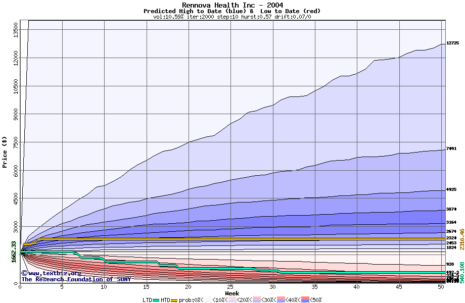 The high to date and low to date prices of the stock plotted against a random walk model for 2004 (what's this?).