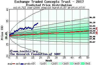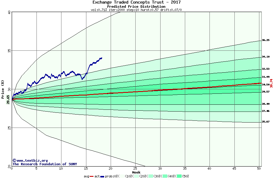 The following graph plots the year-to-date performance of the stock for 2017 compared to the probability calculated by a random walk model.