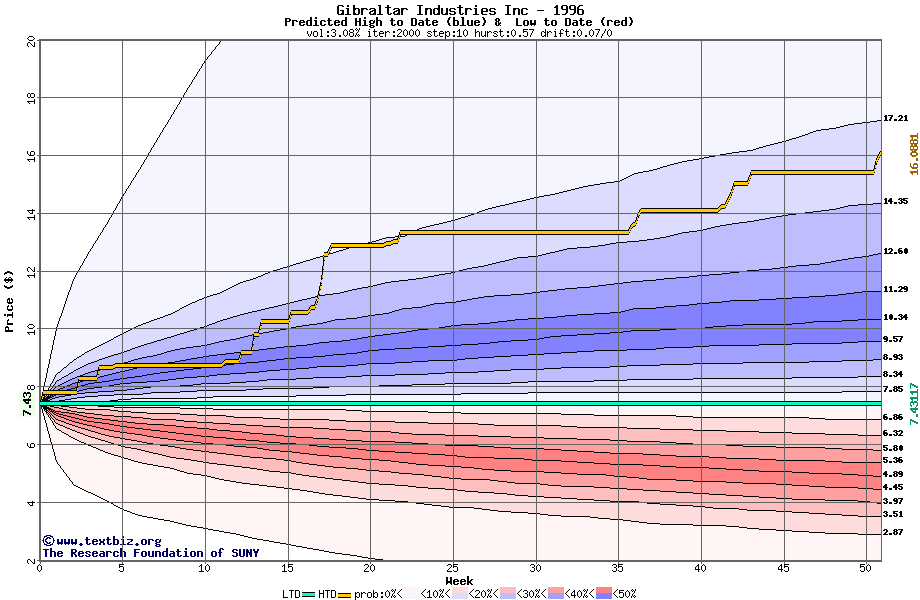 The high to date and low to date prices of the stock plotted against a random walk model for 1996 (what's this?).