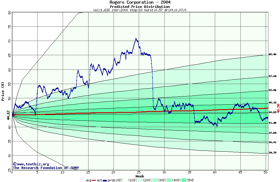 The following graph plots the year-to-date performance of the stock for 2004 compared to the probability calculated by a random walk model.