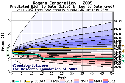 The high to date and low to date prices of the stock plotted against a random walk model for 2005 (what's this?).