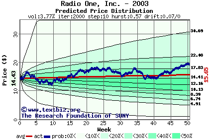 The high to date and low to date prices of the stock plotted against a random walk model for 2003 (what's this?).