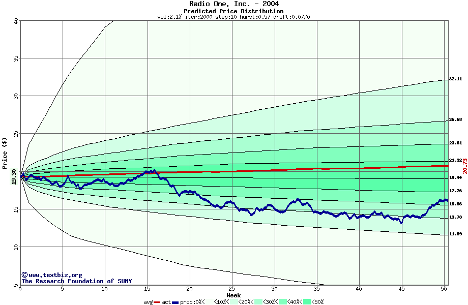 The following graph plots the year-to-date performance of the stock for 2004 compared to the probability calculated by a random walk model.