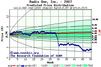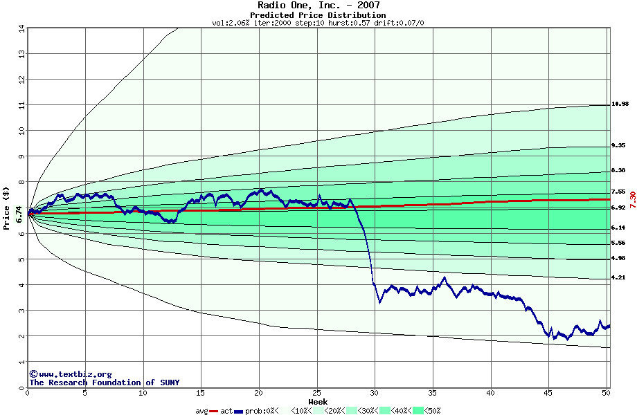 The following graph plots the year-to-date performance of the stock for 2007 compared to the probability calculated by a random walk model.