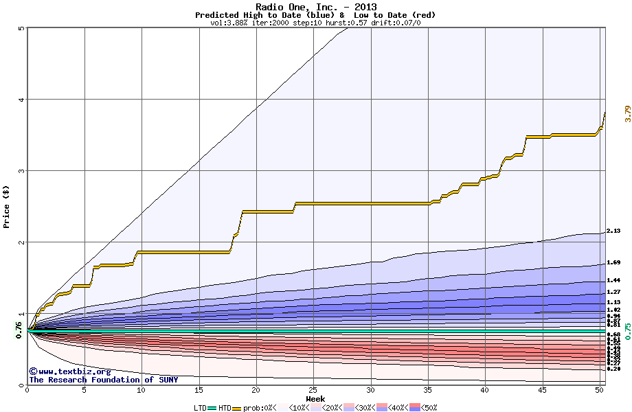 The high to date and low to date prices of the stock plotted against a random walk model for 2013 (what's this?).