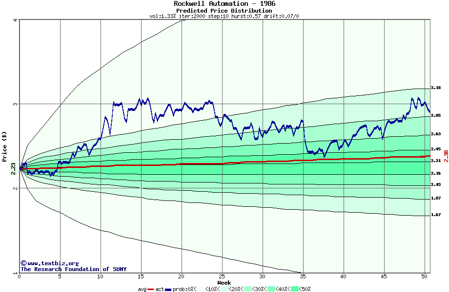 The following graph plots the year-to-date performance of the stock for 1986 compared to the probability calculated by a random walk model.