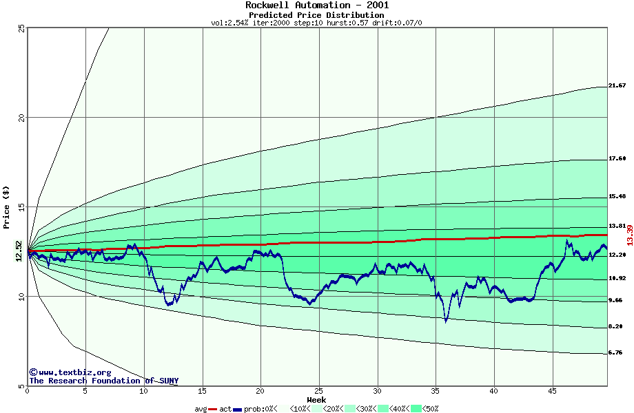 The following graph plots the year-to-date performance of the stock for 2001 compared to the probability calculated by a random walk model.