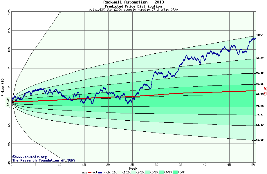 The following graph plots the year-to-date performance of the stock for 2013 compared to the probability calculated by a random walk model.