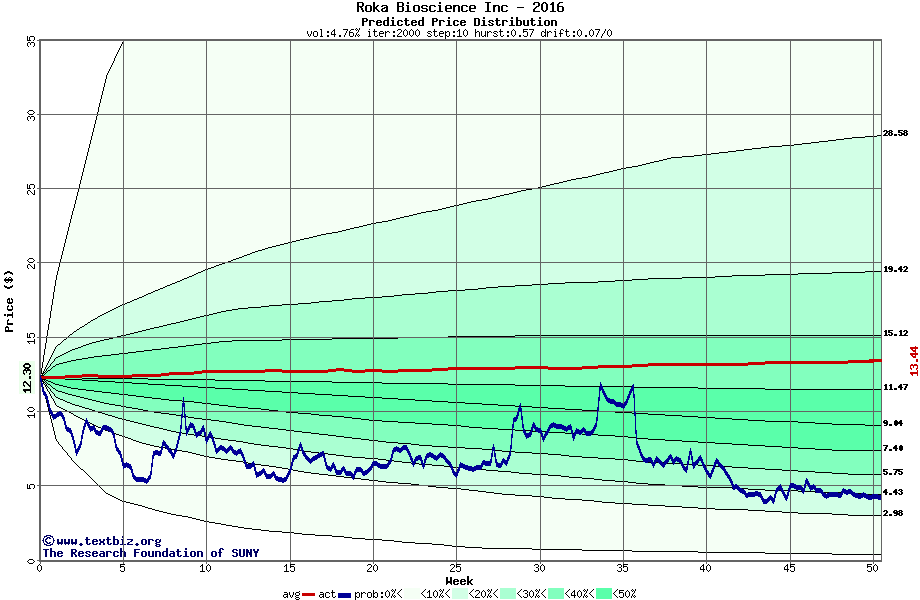 The following graph plots the year-to-date performance of the stock for 2016 compared to the probability calculated by a random walk model.