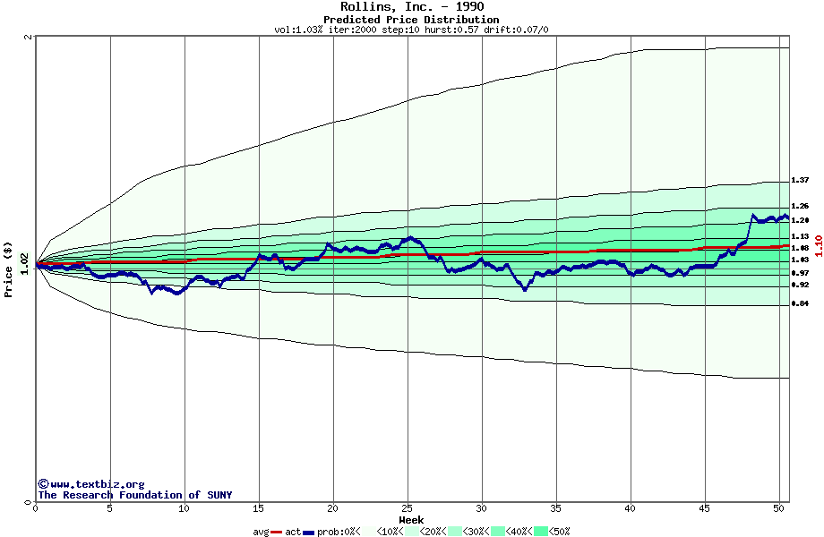 The following graph plots the year-to-date performance of the stock for 1990 compared to the probability calculated by a random walk model.