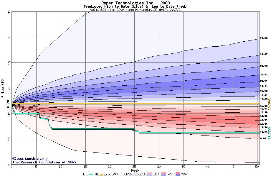The high to date and low to date prices of the stock plotted against a random walk model for 2000 (what's this?).