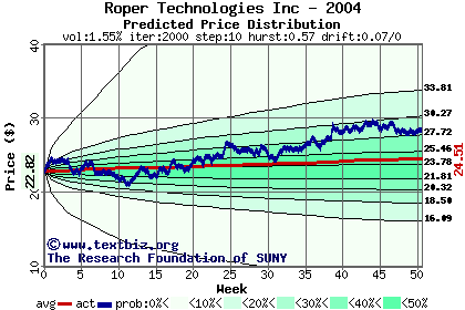 The following graph plots the year-to-date performance of the stock for 2004 compared to the probability calculated by a random walk model.